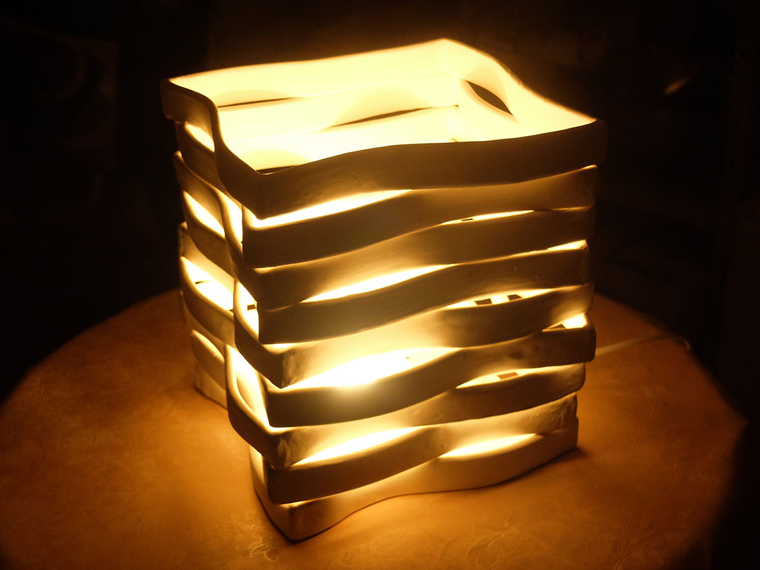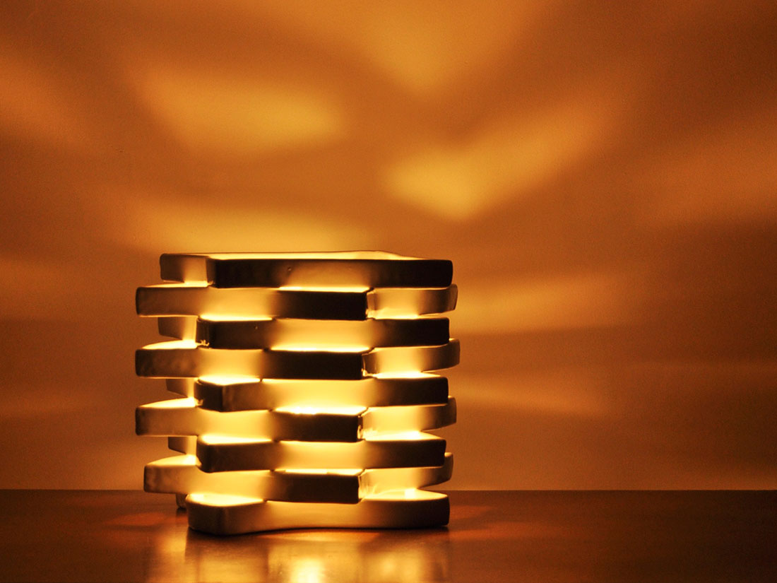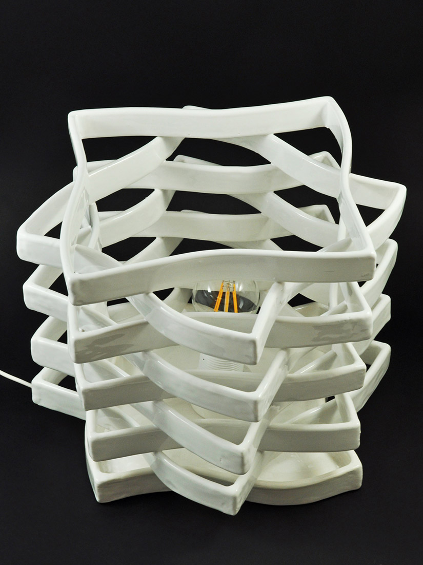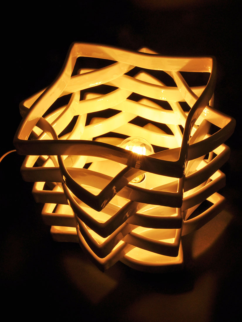 Lampade modulari in ceramica che giocano con le forme in modo più o meno audace, con angoli sporgenti o curve leggere, che lasciano passare la luce o la catturano all’interno ponendo barriere.