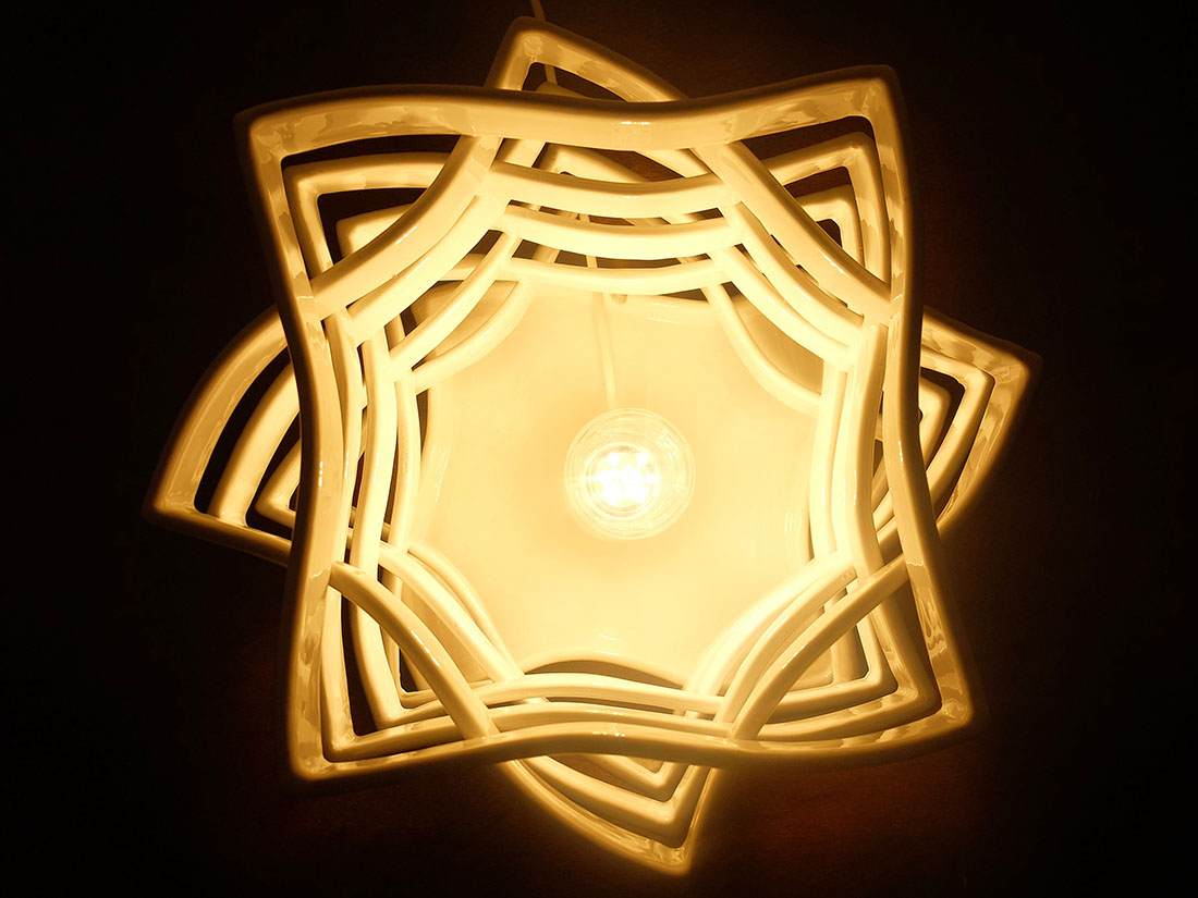 La materia solida della ceramica e la sinuosità morbida della luce: elementi opposti ma complementari che si fondono elegantemente nel chiaroscuro di pieni e vuoti. Spente attirano lo sguardo con le loro geometrie, accese ritagliano scintille luminose sui muri per creare un’atmosfera da sogno.